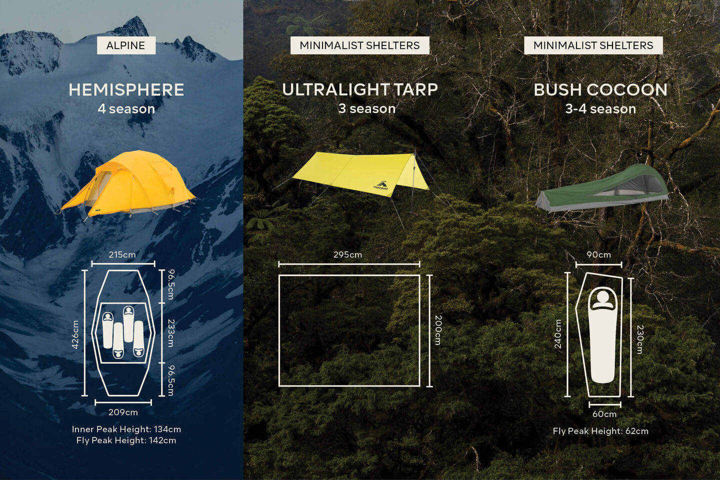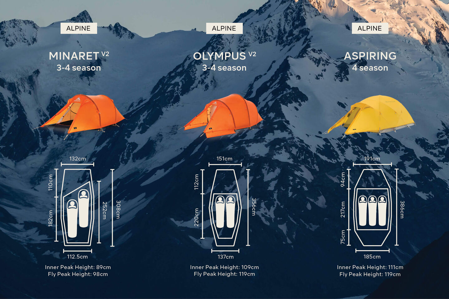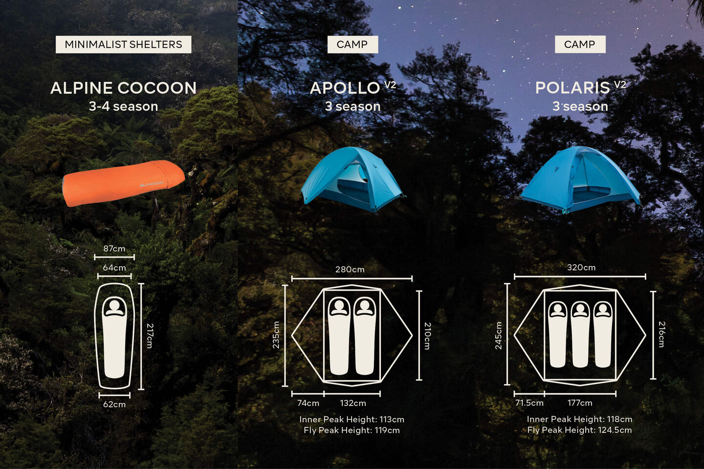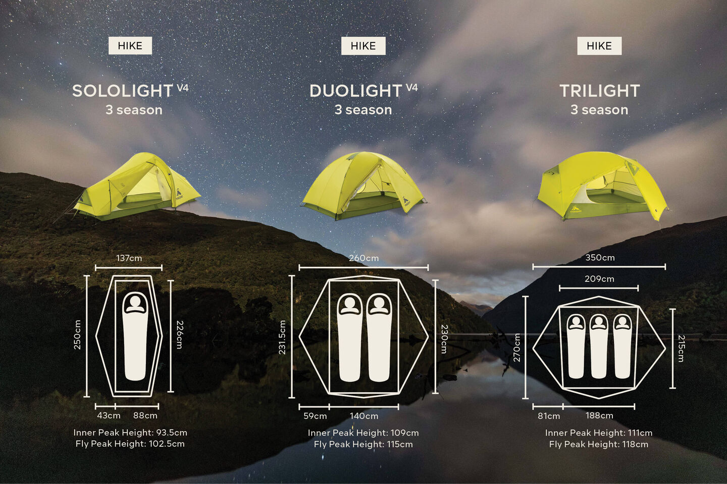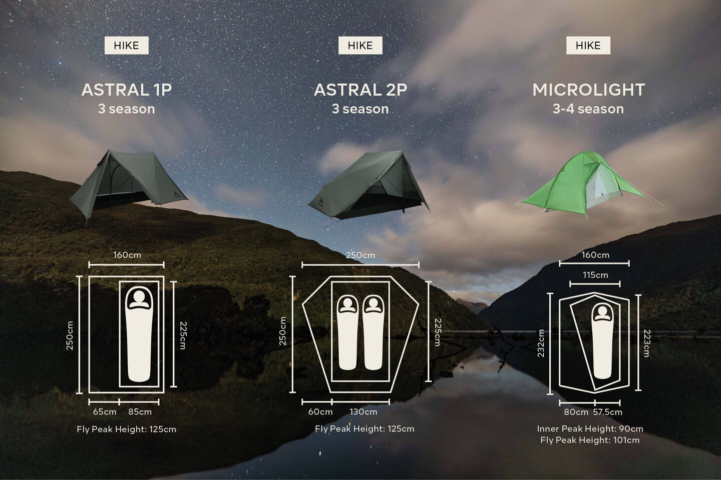 Choose a tent that will sleep the minimum number of people you need it to. Also consider the size of your sleeping mat and whether you require additional space for gear inside the tent. If you need extra room, opt for one with a larger floor plan size, like the Equinox, Solstice, Hemisphere, or Aspiring. If saving space and weight is important, the Astral – pitched with trekking poles – is your best bet.
