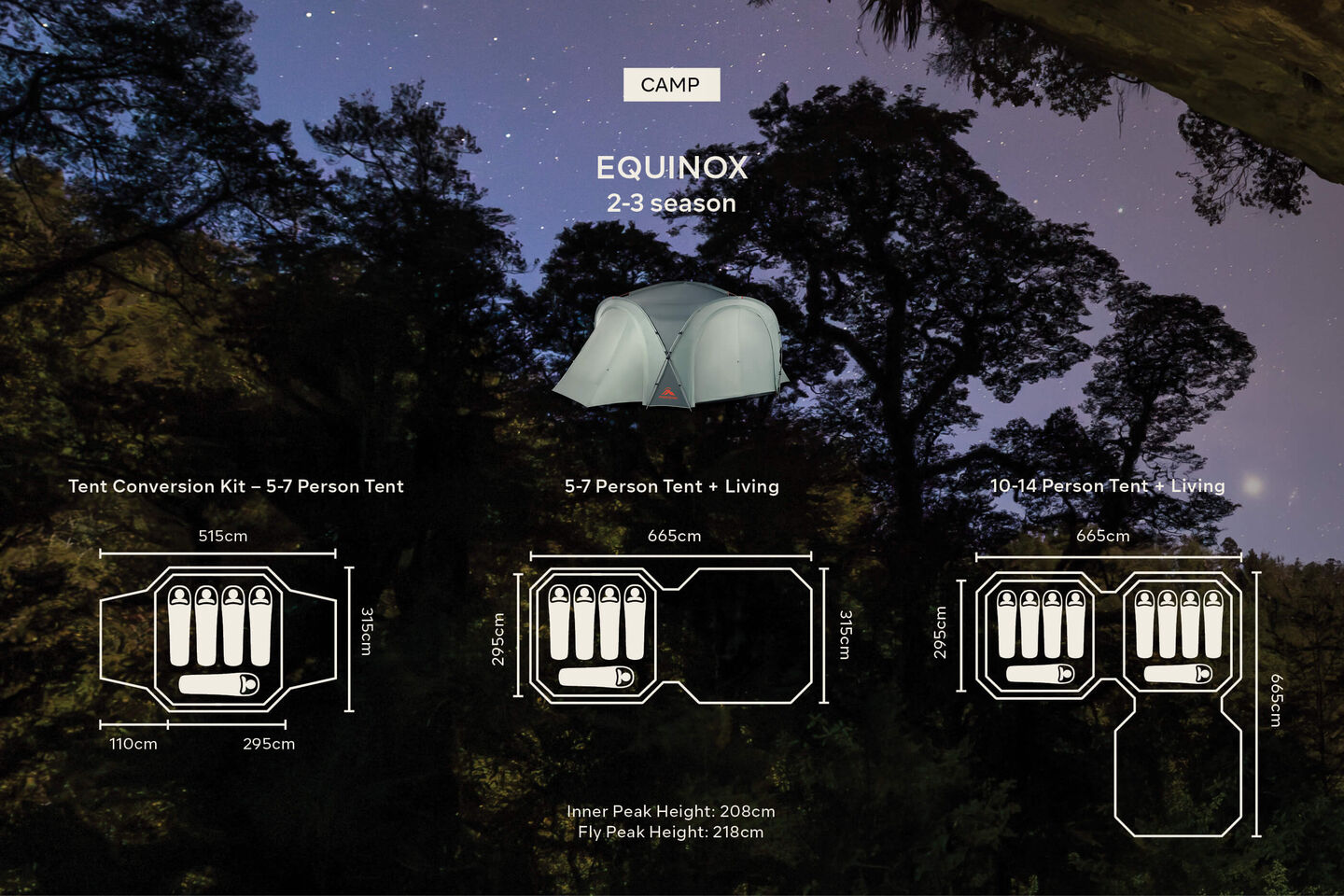 If you have the Equinox Shelter, you can easily convert it to a fully enclosed tent which sleeps five-seven people with this Equinox 5+ Tent Conversion Kit. The Equinox range is modular and fully customisable.