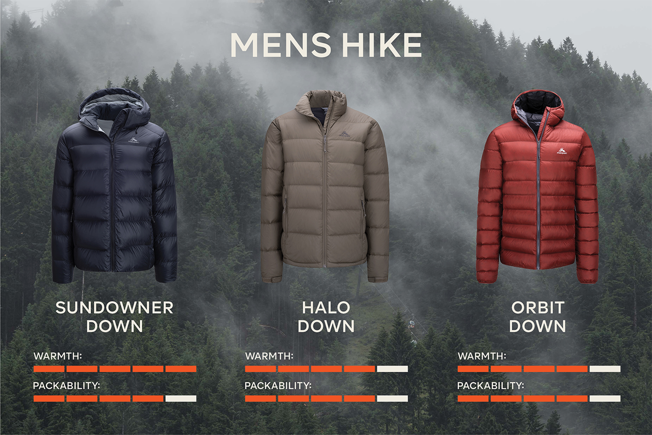 A hooded down jacket that provides warmth in cold, damp conditions. Suited for everything from hiking to casual strolls.